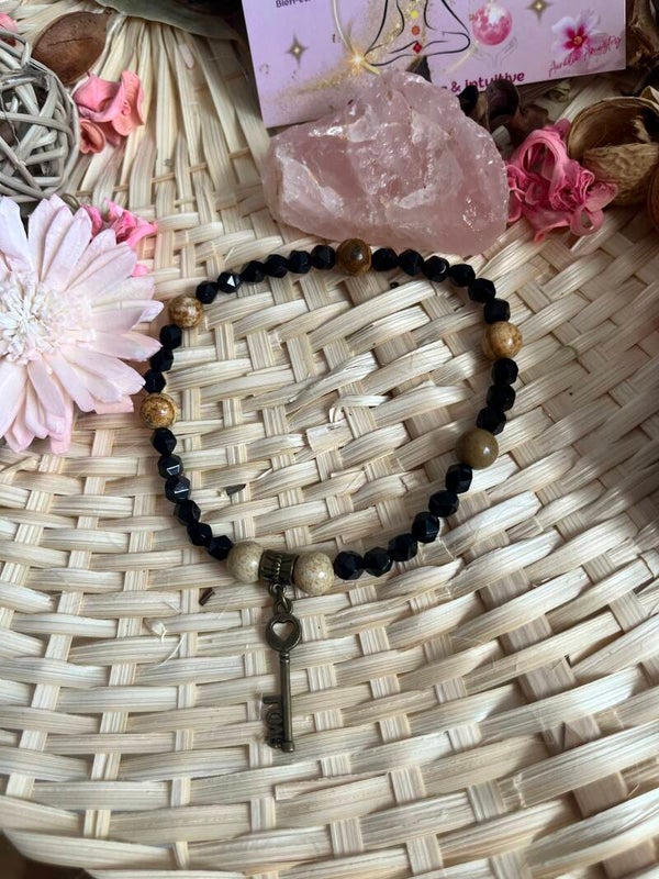 Le bracelet de cheville Clé d’Ancrage est une création à la fois élégante et profondément enracinante. Il associe la sagesse tranquille du jaspe paysage, la force protectrice de l’agate noire, et un petit charm en forme de clé, symbole d’ouverture et de passage vers de nouveaux horizons.
