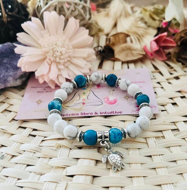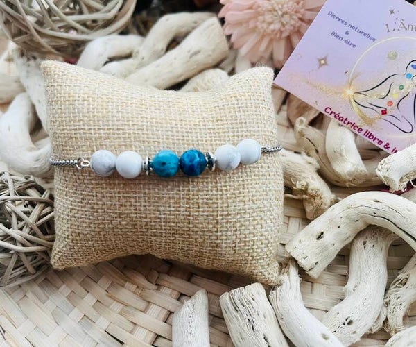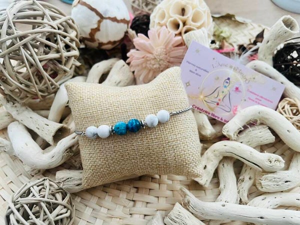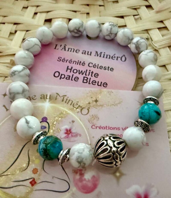 Le bracelet Sérénité Céleste unit l’apaisement profond de la Howlite et la douceur intuitive de l’Opale Bleue. Ensemble, elles offrent un bijou délicat qui favorise la paix intérieure, la clarté d’esprit et une meilleure communication avec soi-même et les autres.