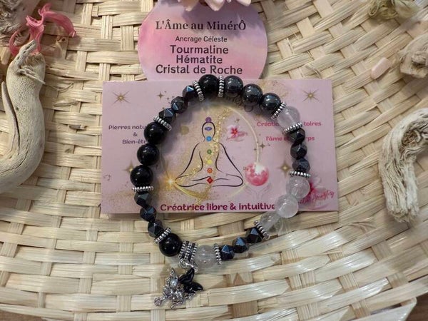 🌃 Le bracelet Ancrage Céleste allie la force protectrice de la Tourmaline et de l’Hématite à la lumière pure du Cristal de Roche, pour un équilibre entre Terre et Ciel.